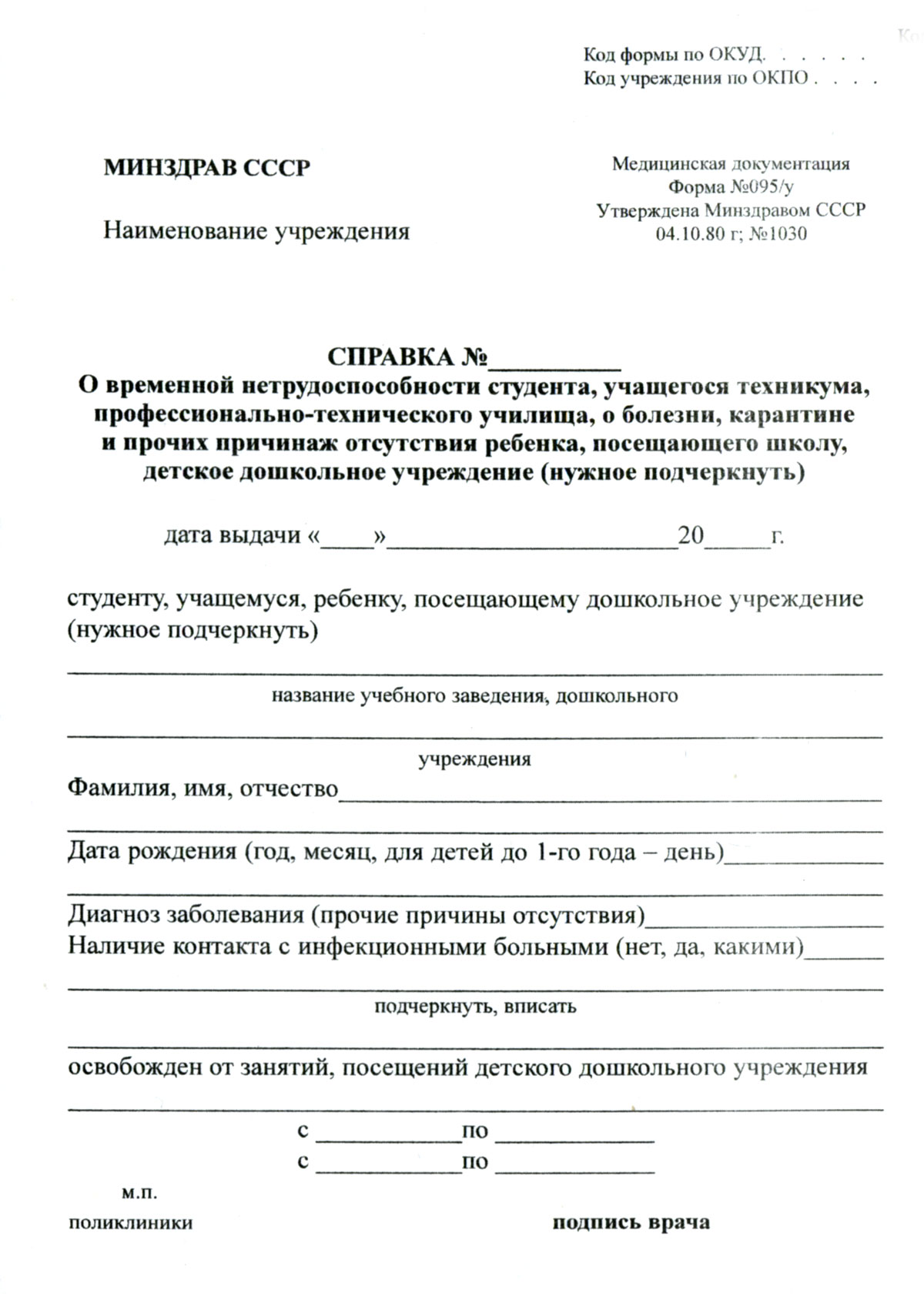 - оправдания отсутствия в детских садах, средних/средне/специальных/высших учебных учреждениях дошкольников/школьников/студентов;